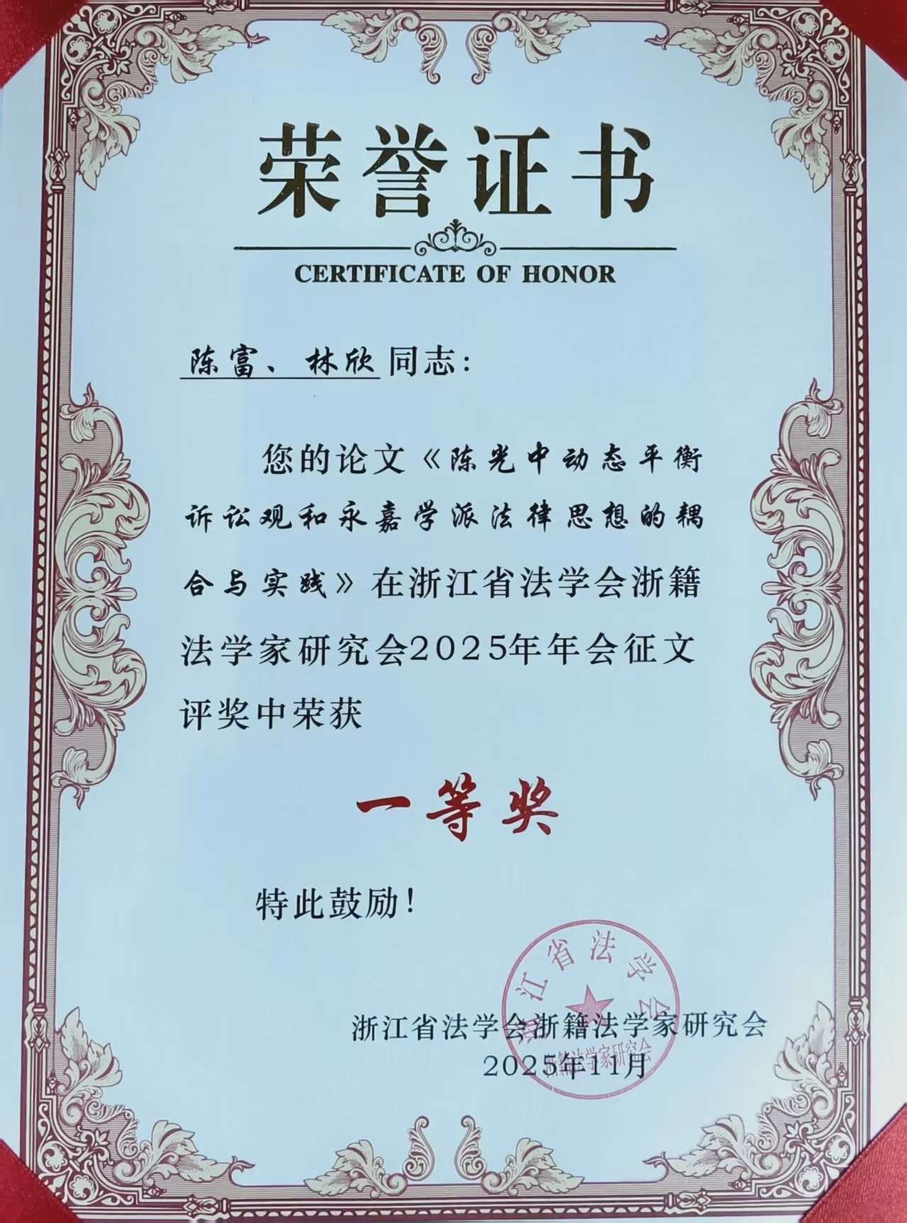 2025年11月15日,浙籍法学家研究会、法治浙江研究院2025年年会在温州市永嘉县召开,会上公布了浙江省法学会浙籍法学家研究会2025年年会征文活动结果。 其中,泰顺县人民检察院党组成员、副检察长陈富和温州市人民检察院四级高级检察官林欣共同撰写的论文《陈光中动态平衡诉讼观和永嘉学派法律思想的耦合和实践》荣获一等奖!